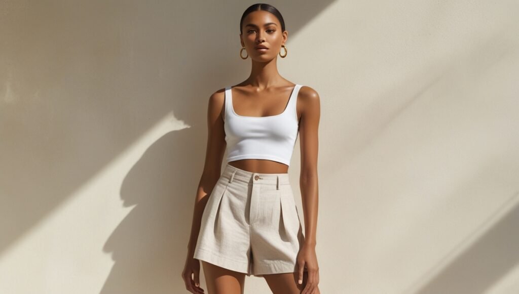 Officewear just got interesting. A linen skort paired with a cropped blazer or relaxed button-down feels intentional yet breezy. Stick to tonal shades (ivory, tan, charcoal) and finish with loafers or kitten heels.